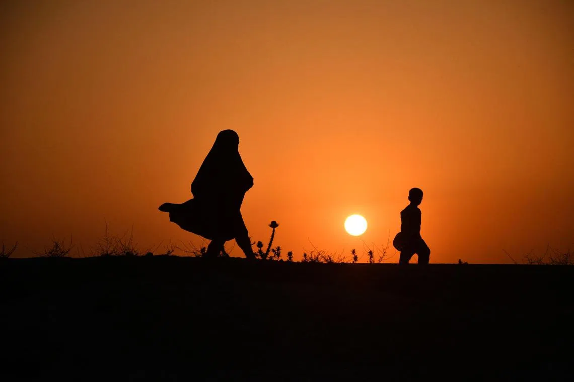 Seorang wanita dan seorang budak lelaki berjalan di sepanjang lereng bukit semasa matahari terbenam di pinggir Mazar-i-Sharif pada 4 Jun 2025 (Gambar hiasan). - Foto hiasan AFP