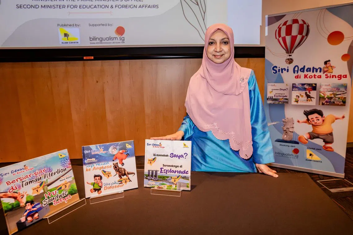 SIRI BUKU TERBARU: Cik Hana Mohd melancarkan buku bersiri terbaharunya yang bertajuk, Adam di Kota Singa, tentang seorang budak lelaki bernama Adam yang suka meneroka Singapura. - Foto-foto BH oleh NUR DIYANA TAHA -