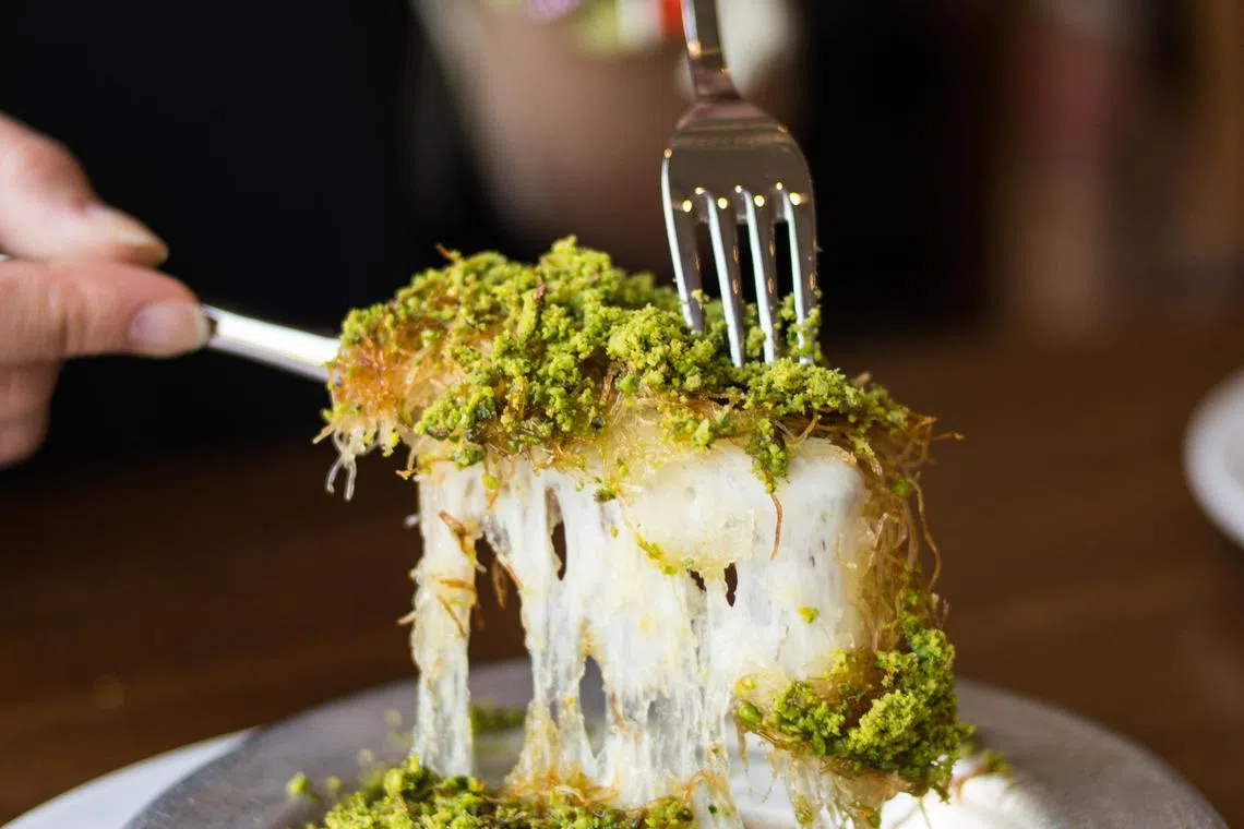 Kelima, taburkan separuh doh kunafa ini pada loyang kemudian masukkan adunan krim keju yang telah dipukul tadi. Keenam, tabur keju cheddar dan keju mozzarella. Akhir sekali, tutup krim keju dengan sisa kunafa doh tadi dan bakar dalam ketuhar pada suhu 180C selama 15 hingga 20 minit atau sehingga kekuningan.