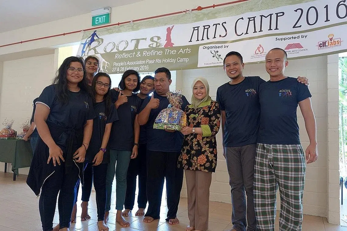 PELAJARI BAHASA DAN SENI MENERUSI PERKHEMAHAN: Anggota Parlimen (AP) GRC Jurong, Cik Rahayu Mahzam (baju bunga) menyampaikan hadiah kepada para peserta Perkhemahan Seni, Akar! yang diadakan awal tahun sambil diiringi Raja Hamzah (dua dari kanan). - Foto VARIASI PERFORMING ARTS -