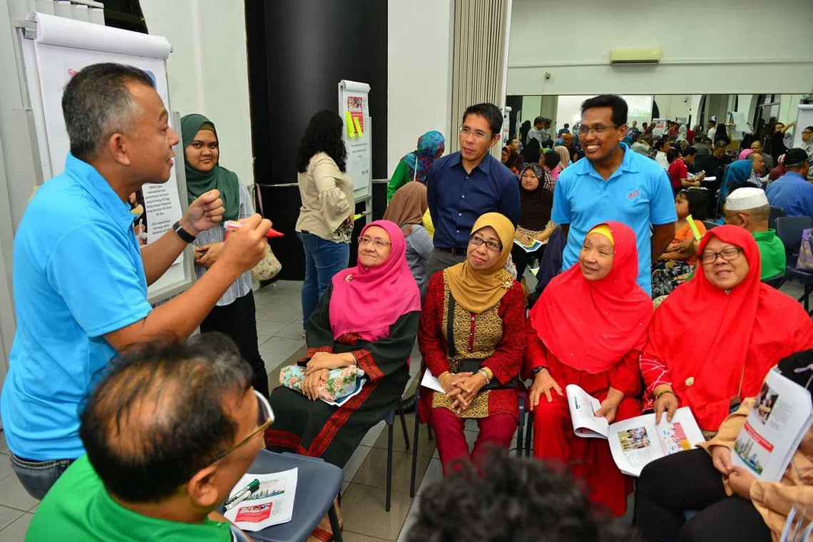 DIALOG RAPAT HARI KEBANGSAAN: Timbalan pengerusi MAEC Siglap, Encik Najib Ahmad (kiri) memimpin perbincangan dengan penduduk, disaksikan oleh penasihat pertubuhan akar umbi GRC East Coast, Dr Mohamad Maliki Osman (baju biru gelap) dan pengerusi MAEC, Encik Yacob Hussain (di kiri beliau.) - Foto KELAB MASYARAKAT SIGLAP -