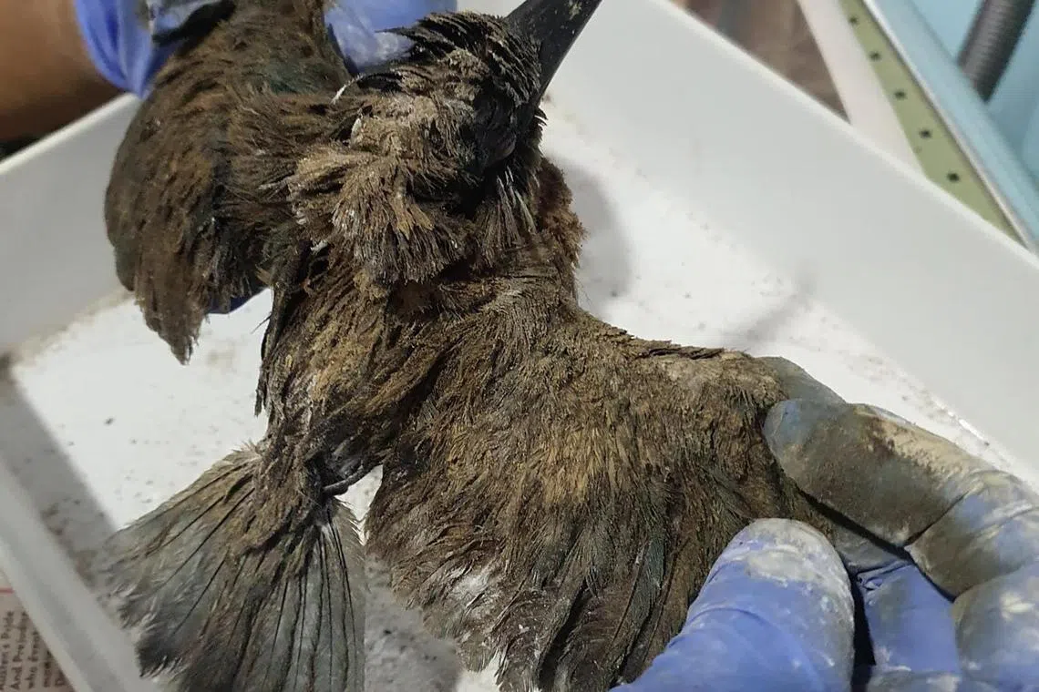 Empat burung raja udang yang disaluti minyak telah diselamatkan selepas kejadian tumpahan minyak pada 14 Jun, namun dua daripadanya telah mati.