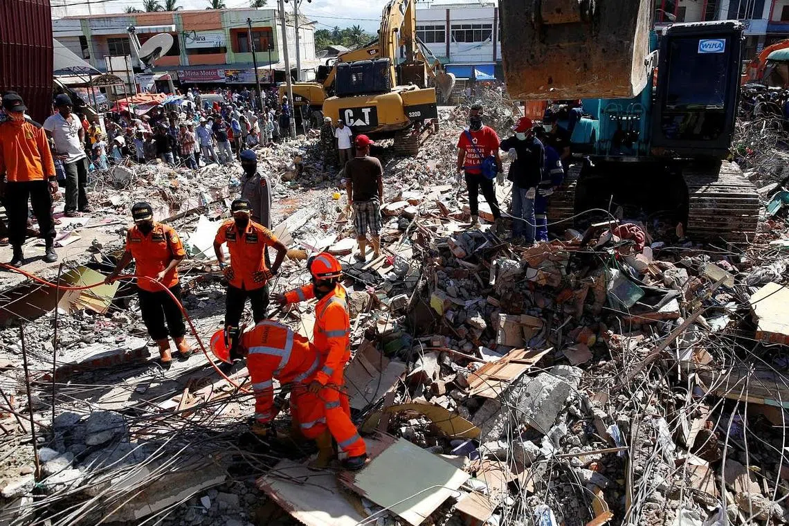 MENCARI MANGSA TERPERANGKAP: Anggota penyelamat dengan menggunakan jentera berat giat mengalihkan timbunan runtuhan untuk mencari mangsa yang terperangkap di pasar Meureudu, Pidie Jaya, Aceh, semalam. - Foto REUTERS -
