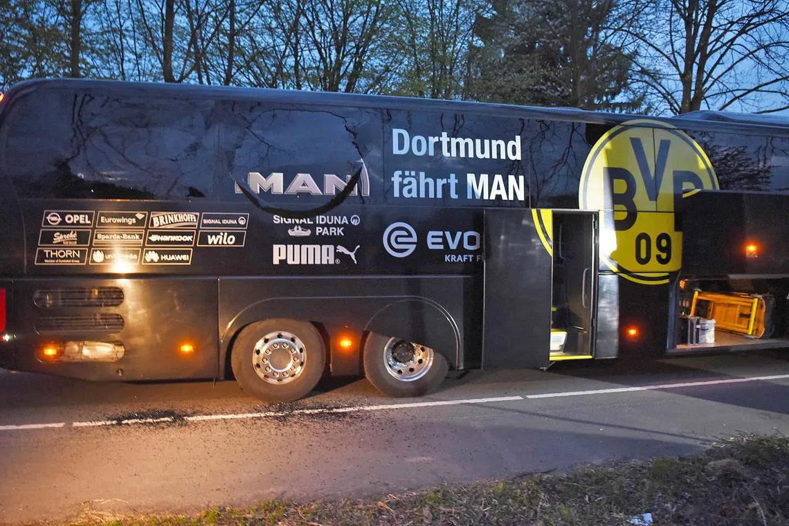 ROSAK SELEPAS LETUPAN: Bas rasmi yang membawa pasukan bola sepak Borussia Dortmund rosak teruk selepas tiga letupan berlaku berhampiran bas itu pada 7.15 malam semalam waktu tempatan, menyebabkan seorang pemain cedera dan cermin bas itu rosak teruk. - Foto REUTERS -