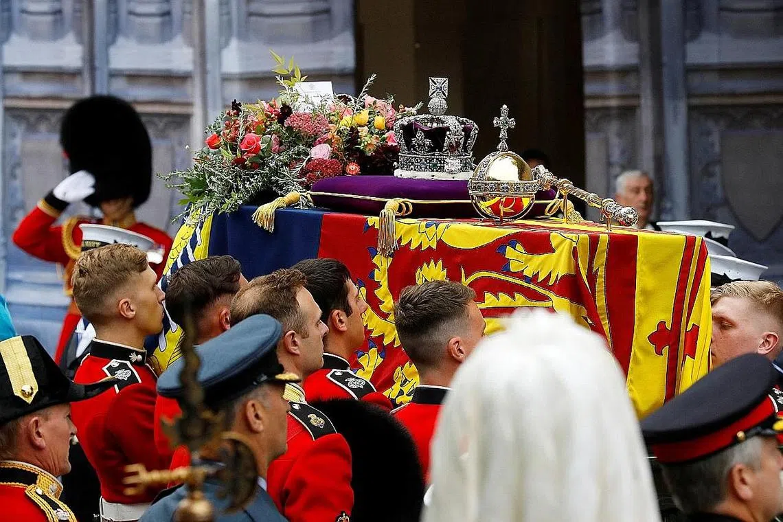KERANDA DIUSUNG: Keranda Ratu Elizabeth II dengan Mahkota Imperial Negara terletak di atasnya dibawa ke Westminster Abbey di London, England semalam. - Foto-foto REUTERS -