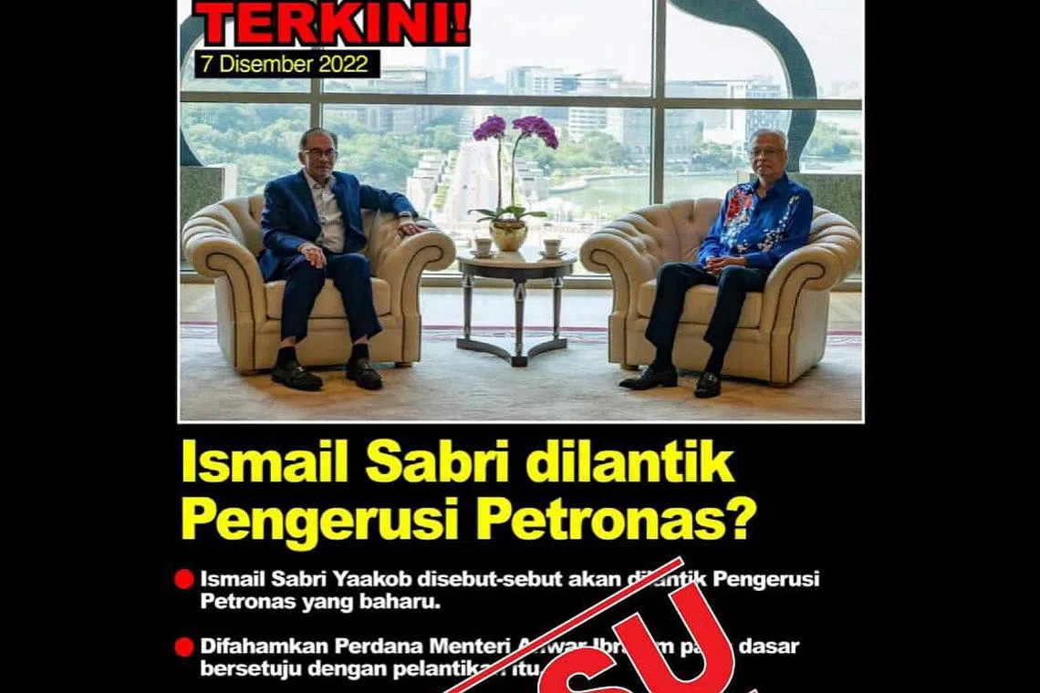 Terdahulu, tular di media sosial apabila orang ramai berkongsi poster yang memaparkan gambar pertemuan Perdana Menteri, Datuk Seri Anwar Ibrahim, dengan Datuk Seri Ismail Sabri Yaakob, dengan beberapa maklumat yang menyatakan kononnya Datuk Seri Anwar secara dasar telah bersetuju dengan pelantikan Datuk Ismail Sabri sebagai Pengerusi Petronas. - Agensi berita.