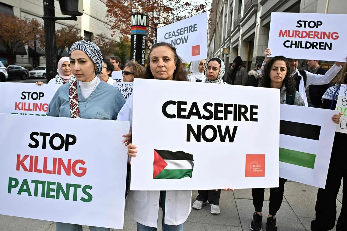 DESAK SEGERAKAN GENCATAN SENJATA: Peserta yang terlibat dalam tunjuk perasaan di Washington menuntut peperangan di Gaza dihentikan dan gencatan senjata disegerakan.