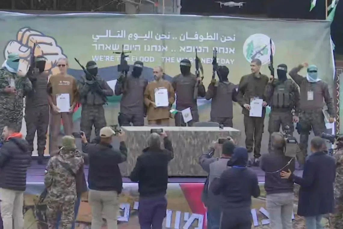 Puluhan anggota Hamas yang bertopeng dan bersenjata telah dikerahkan di Deir al-Balah, di tengah Gaza, untuk penyerahan tebusan itu kepada ICRC, yang kemudian memindahkan mereka kepada pasukan Israel di Gaza, lapor BBC.