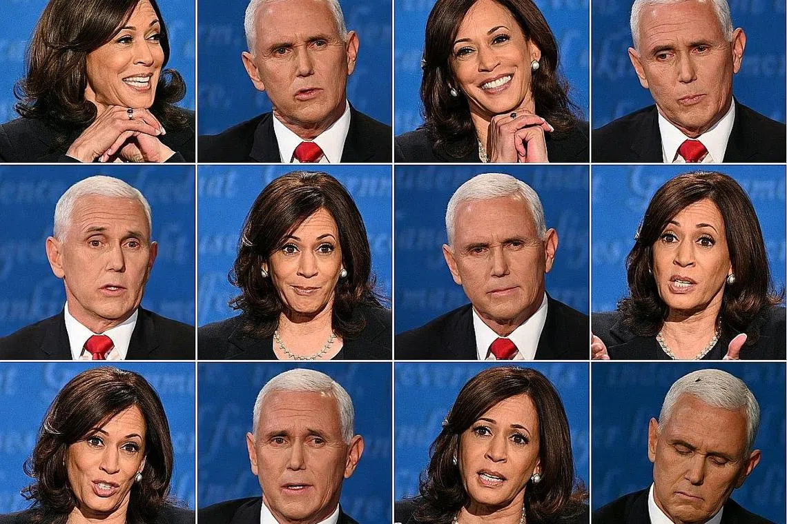 SEJUTA MAKNA: Gambaran wajah-wajah calon naib presiden bagi Parti Demokrat, Cik Kamala Harris, dan Naib Presiden Mike Pence, dari Parti Republikan, menunjukkan pelbagai reaksi berbeza semasa sesi perbahasan mereka di University Utah, Salt Lake City, 9 pagi semalam waktu Singapura. - AFP -