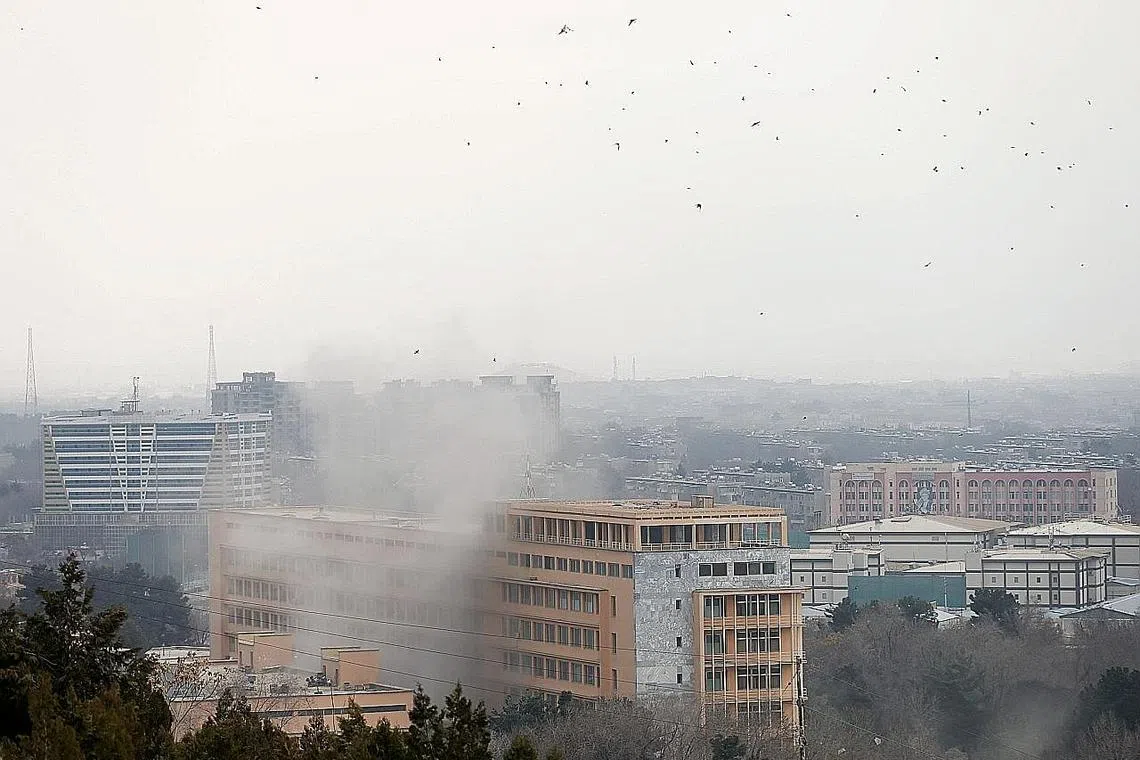 AKIBAT SERANGAN: Asap tebal kelihatan di sekitar hospital tentera di Kabul menyusuli serangan sekumpualn lelaki bersenjata semalam. - Foto REUTERS -