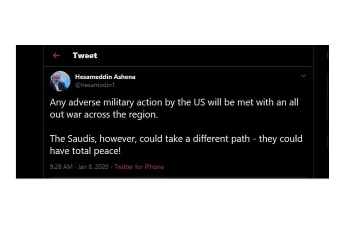 Penasihat Presiden Iran, Hassan Rouhani, Hessameddin Ashena, berkata demikian dalam posnya di Twitter baru-baru ini. "Sebarang tindakan oleh Amerika akan disambut dengan perang besar-besaran di Asia Barat. Arab Saudi mungkin boleh membuat pilihan lain, mereka boleh capai keamanan mutlak," katanya. Beliau berkata demikian mengulas mengenai serangan terbaru di mana sekurang-kurangnya 12 peluru berpandu disasarkan terhadap markas udara al-Asad dan Erbil di Iraq, yang menempatkan tentera Amerika dan tentera bersekutu. Pasukan Pengawal Revolusi Iran (IRGC) mengesahkan mereka melancarkan serangan bagi membalas dendam atas kematian komander tertinggi pasukan itu, Qasem Soleimani, dalam serangan dron Amerika di Iraq Jumaat lalu. Teheran dan Riyadh terbabit dalam perang proksi di Asia Barat sejak berdekad lamanya, dari Iraq hingga ke Syria dan Yaman. Iran juga sudah berulang kali menggesa seterunya, Arab Saudi, supaya memperbaiki hubungan dengan Teheran. - Reuters