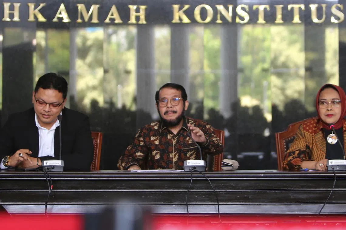 JAWAB KRITIKAN: Ketua Hakim Mahkamah Perlembagaan (MK) Indonesia, Encik Anwar Usman (tengah); Hakim Konstitusi, Cik Enny Nurbaningsih, serta jurucakap MK, Encik Fajar Laksono, semasa sidang media pada Isnin bagi menjawab kritikan awam tentang keputusan MK menukar syarat kelayakan bertanding sebagai calon naib presiden - Foto MAHKAMAH KONSTITUSI