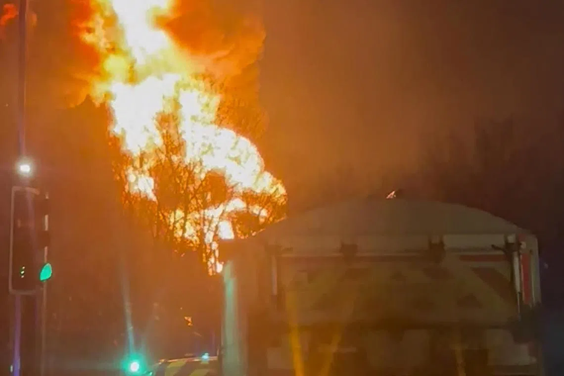 Tangkap layar ini diambil daripada video pengguna yang dirakam dan dimuat naik ke platform X pada 21 Mac 2025 oleh akaun @fire_at_Vill, menunjukkan kebakaran sedang marak di sebuah pencawang elektrik kejiranan yang membekalkan kuasa kepada Lapangan Terbang Heathrow di Hayes, barat London. - Foto AFP
