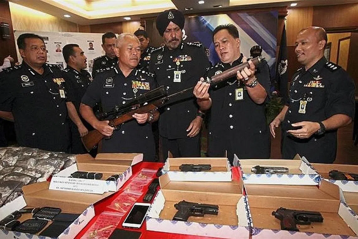 DIRAMPAS: Pengarah Jabatan Siasatan Jenayah Bukit Aman Datuk Seri Mohmad Salleh (dua dari kiri) menunjukkan raifal yang dirampas dalam Ops Cantas Khas Jenayah Terancang pada sidang akhbar di Ibu Pejabat Polis Kontinjen Kuala Lumpur. - Foto THE STAR -