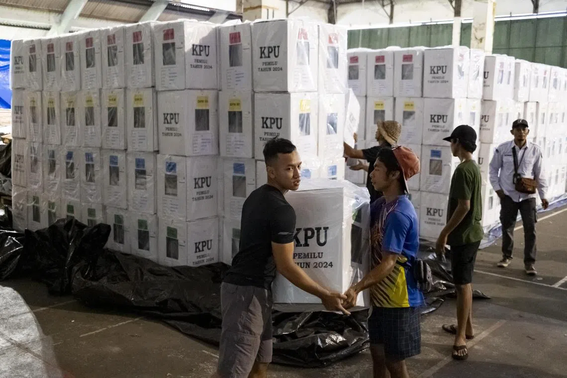 Para pekerja suruhanjaya pilihan raya bekerja keras mengangkat  barang keperluan mengundi di pusat pembahagian di Denpasar, Bali, Indonesia, pada 12 Februari.