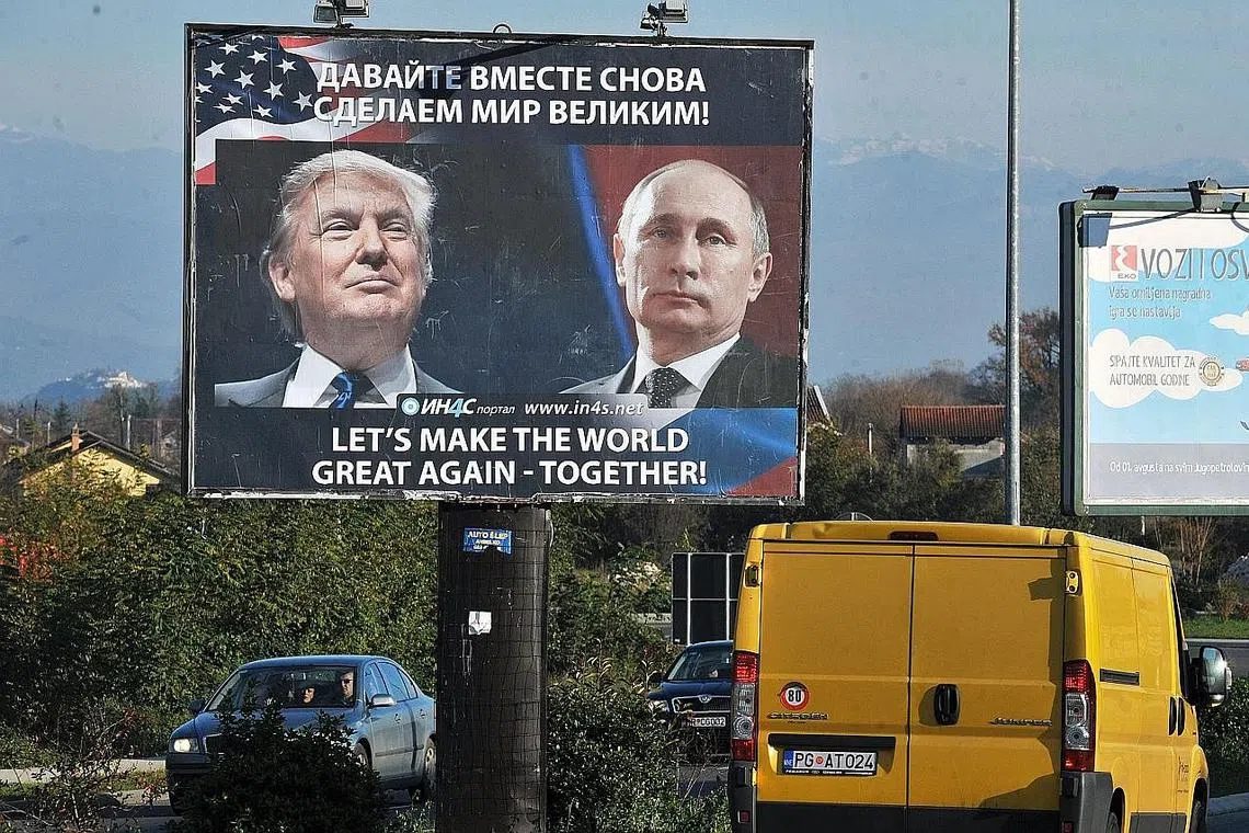 PEMIMPIN DUA KUASA BESAR DUNIA: Papan iklan di bandar Danilovgrad di Montenegro dengan gambar Encik Trump dan Encik Putin dengan mesej "Mari Jadikan Dunia Ini Hebat Semula - Bersama' . - Foto AFP