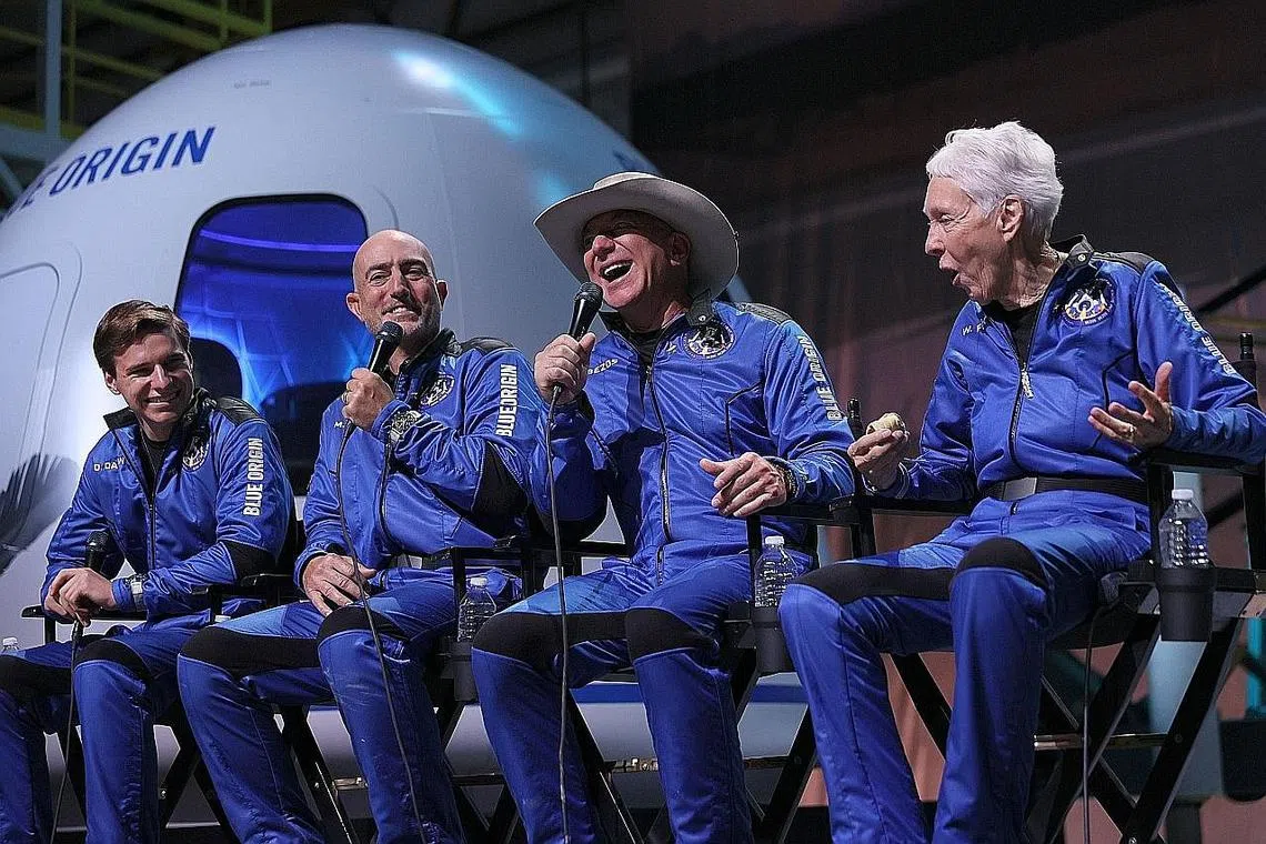 Perintis juruterbang wanita, Cik Wally Funk, dan seorang lulusan sekolah Encik Oliver Daemen masing-masing menjadi orang tertua dan termuda yang mencapai ruang angkasa lepas itu.