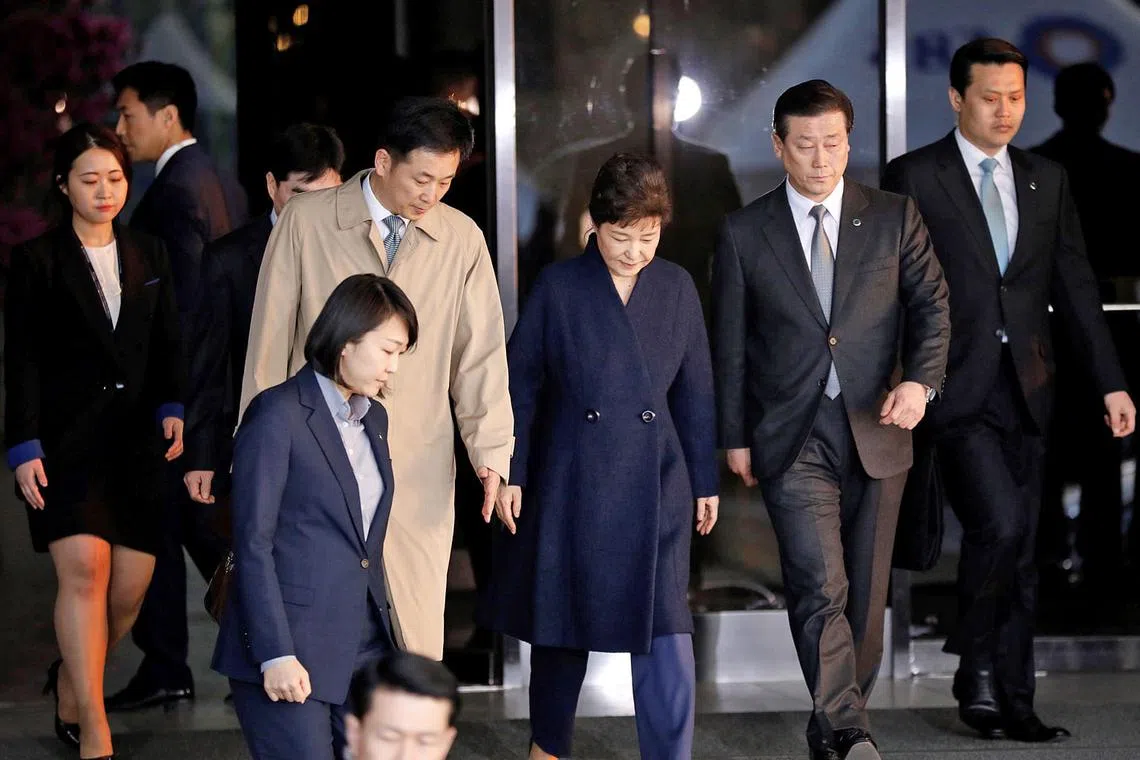 SEOUL: Mantan Presiden Korea Selatan yang disingkirkan, Cik Park Geun-hye, meninggalkan pejabat pendakwa raya awal semalam setelah disoal siasat berhubung skandal rasuah, yang sekali gus melucutkan jawatannya sebagai presiden pada bulan ini.