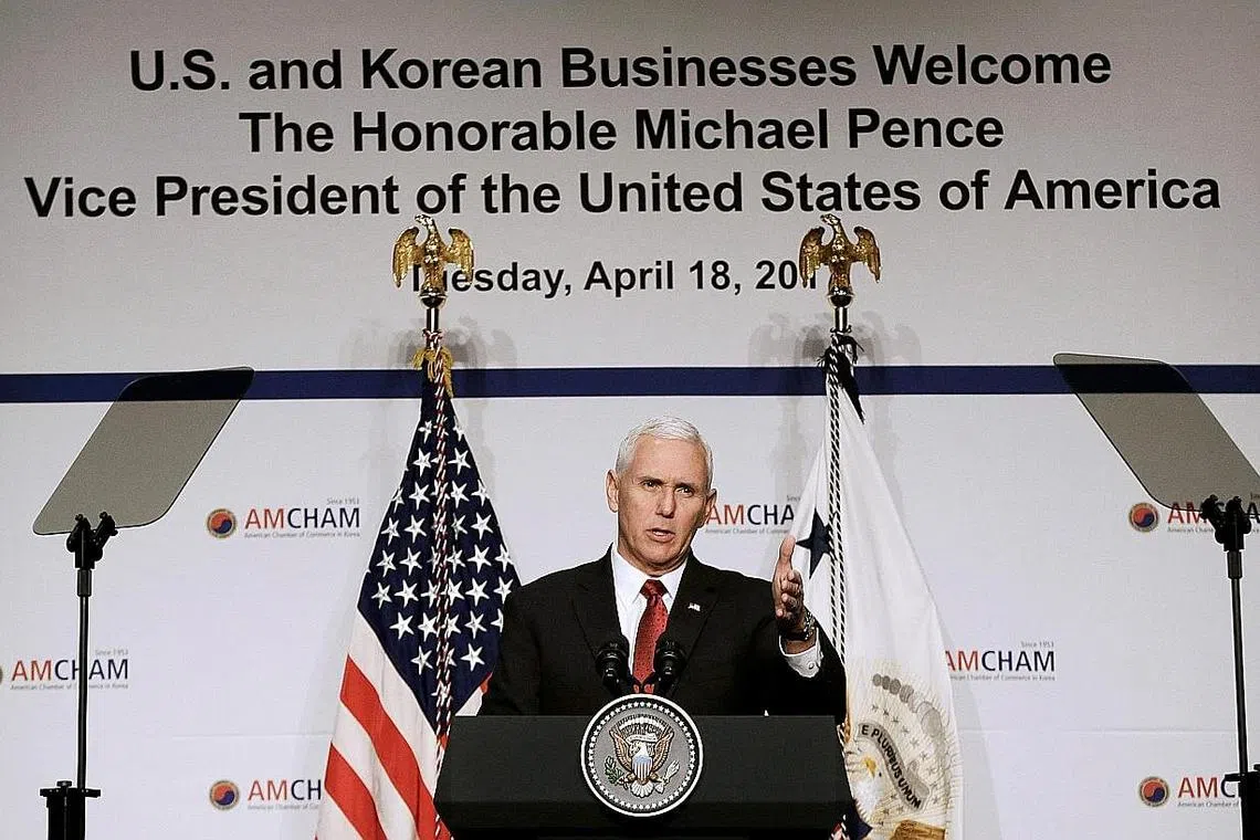 KETENGAHKAN ISU DAGANG: Naib Presiden Mike Pence berucap kepada anggota Dewan Perniagaan Amerika di Seoul semalam. - Foto REUTERS -