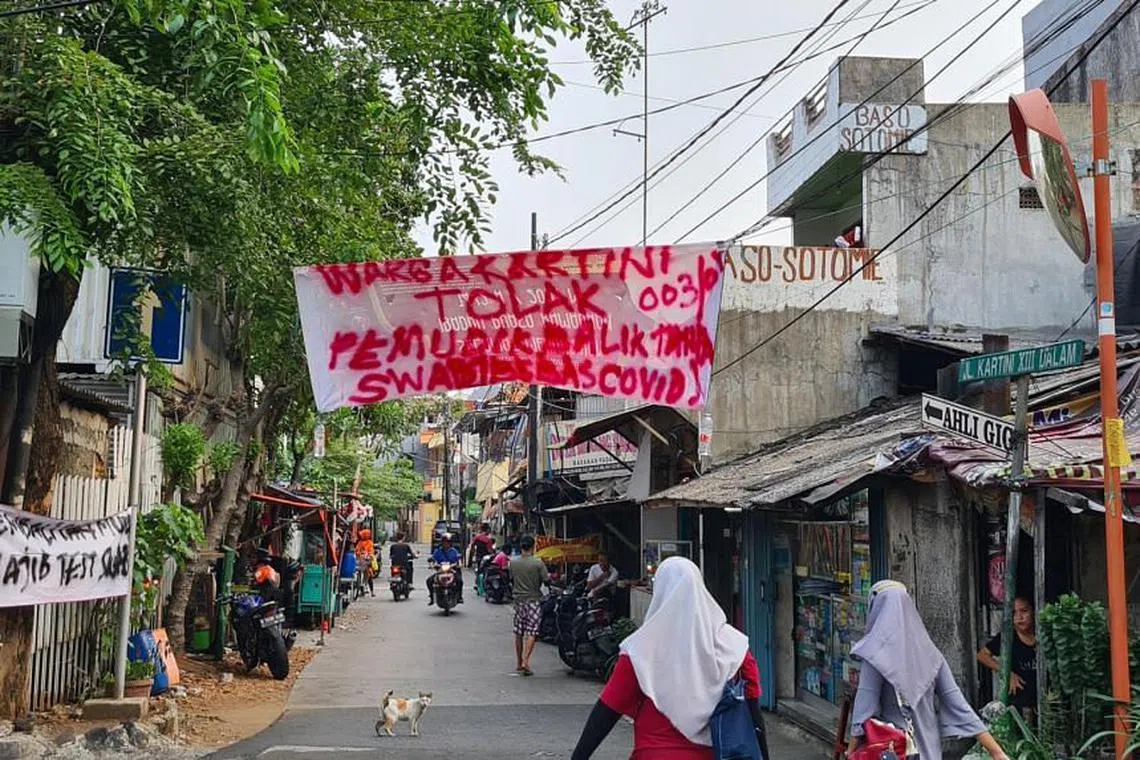 Penduduk desa Kartini di wilayah sampingan Sawah Besar, Jakarta Pusat, Encik Ongis Firman, 43 tahun, berkata beliau dan jirannya mengambil keputusan menyiapkan kain rentang bagi meluahkan pandangan mereka tentang penduduk yang diuji positif koronavirus agar dilarang balik semula ke kediaman mereka di situ.
