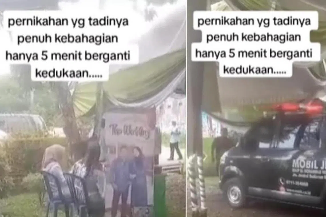 Satu video menunjukkan sebuah kenderaan dengan perkataan “mobil jenazah” (jenazah) memasuki halaman yang dihiasi dengan hiasan perkahwinan. Terdapat sepanduk yang menunjukkan wajah pasangan itu dan teks bertulis “perkahwinan”.