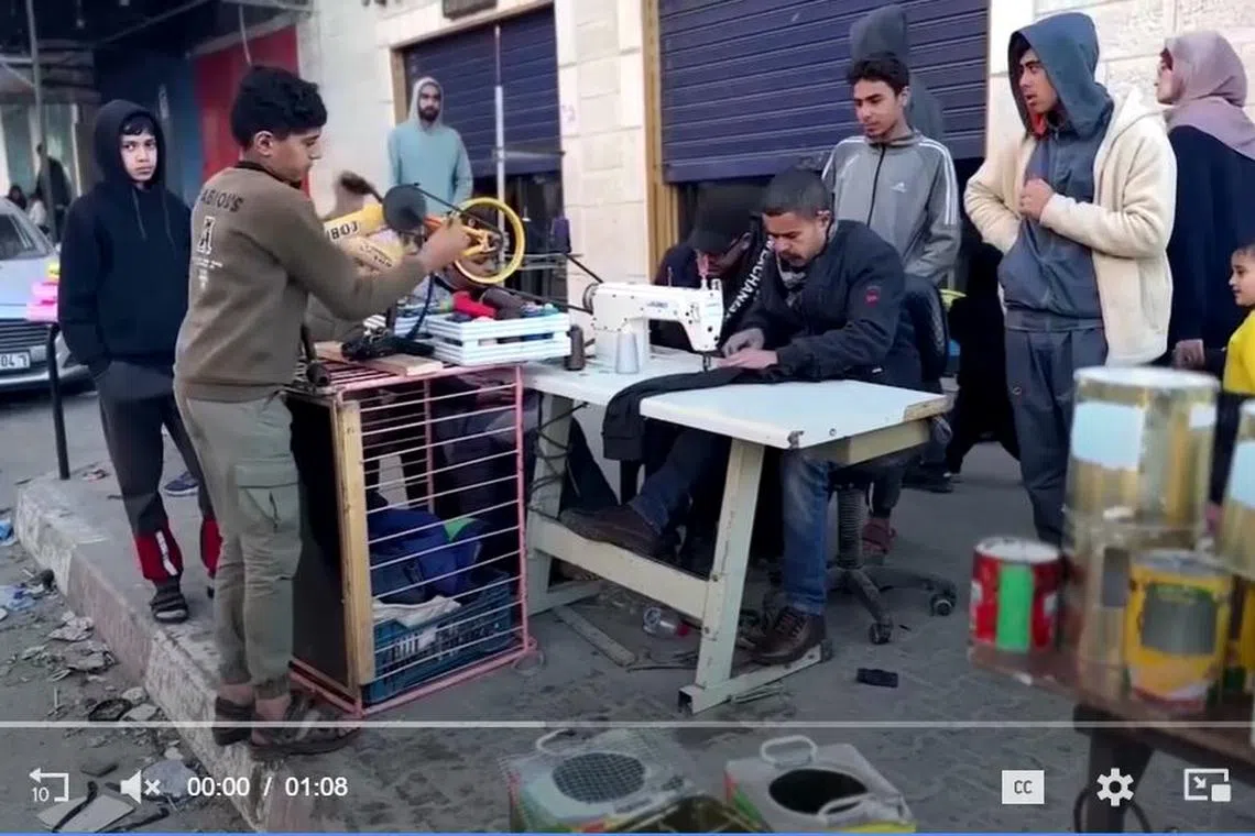 Duduk di tepi jalan di pasar jalanan di Rafah, Encik Majed sibuk mengukur, memotong dan menjahit ketika anaknya, Magdy, memutarkan pedal basikal kanak-kanak yang telah diubah suai untuk menggerakkan mesin jahitnya.