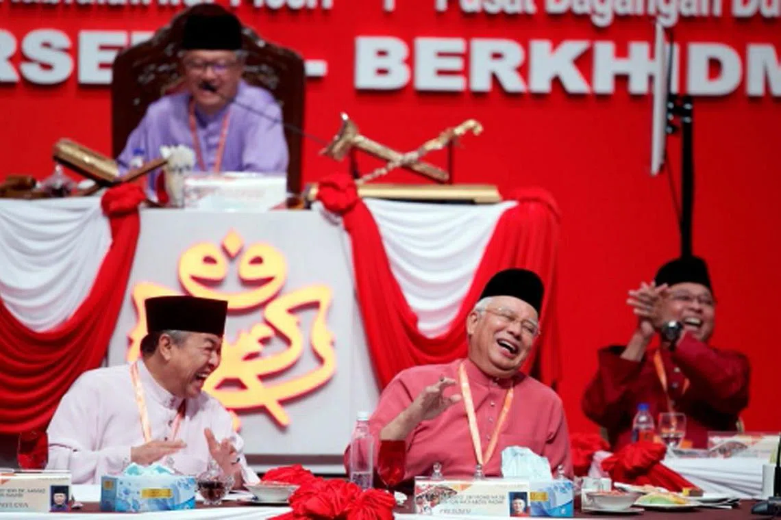 MENCUIT HATI: Presiden Umno, Datuk Seri Najib Razak (tengah), dan Naib Presiden yang menjalankan tugas-tugas Timbalan Presiden, Datuk Seri Dr Ahmad Zahid Hamidi (kiri), ketawa ketika mendengar pembahas usul dari Sabah berucap di Perhimpunan Agung Umno 2016 di Dewan Merdeka, Pusat Dagangan Dunia Putra (PWTC), semalam. - Foto NSTP -