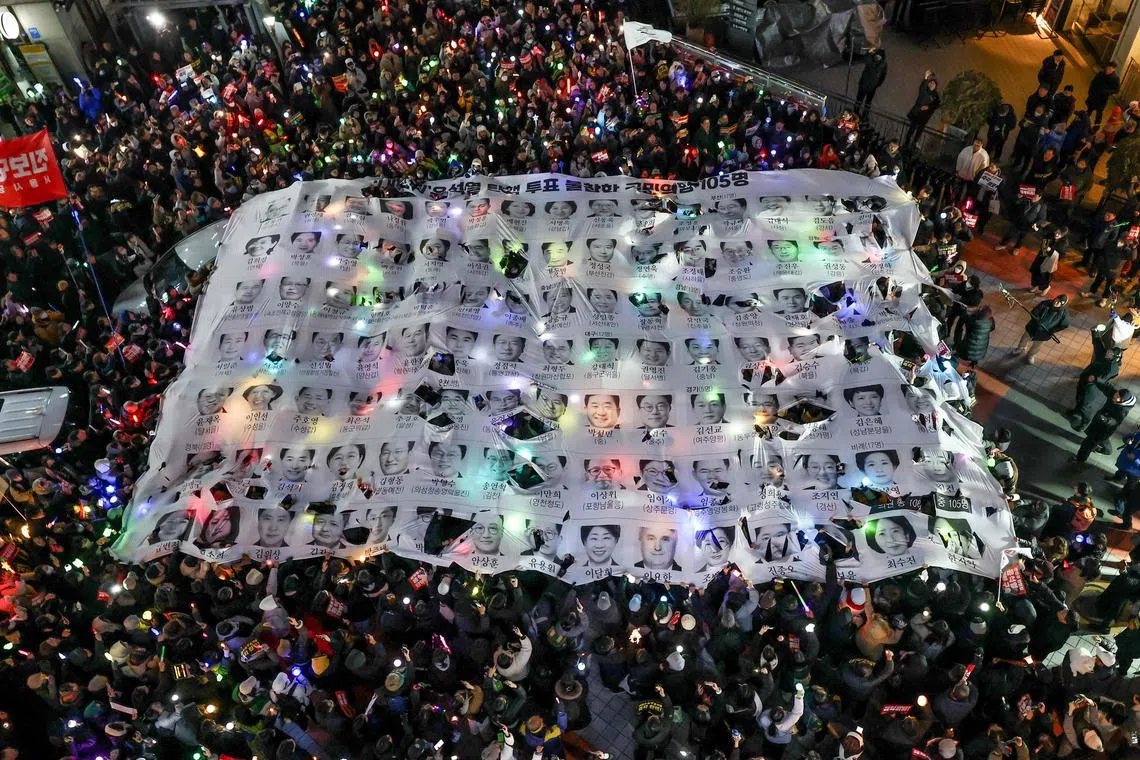 Penunjuk perasaan yang menyertai  perhimpunan lilin bagi menuntut pemecatan Presiden Korea Selatan, Encik Yoon Suk Yeol, mengangkat sepanduk mengecam Ahli Parlimen Parti Kuasa Rakyat yang tidak mengambil bahagian dalam undian pendakwaan  Encik Yoon di hadapan pejabat parti itu di Seoul pada 12 Disember.