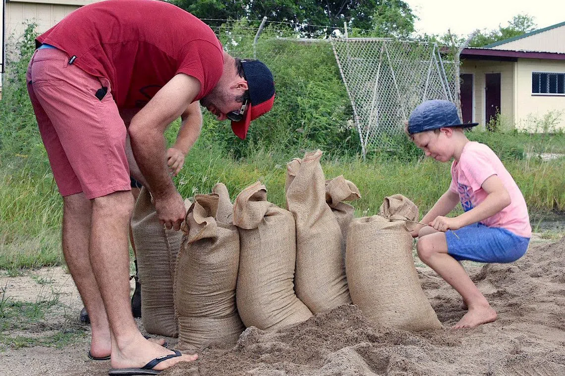 PERSIAPAN TAUFAN: Penduduk di Bowen, selatan Townsville, mengisi beg pasir sebagai persiapan menghadapi puting beliung Debbie semalam. - Foto REUTERS -