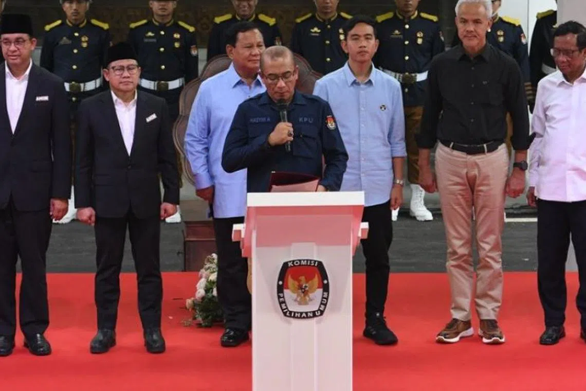 ATURAN PILIHAN RAYA: Ketua Suruhanjaya Pilihan Raya Umum (KPU) Encik Hasyim Asy’ari (tengah) membacakan Deklarasi Kempen Pilihan Raya Aman 2024 di ibu pejabat suruhanjaya itu di Jakarta pada 27 November yang dihadiri oleh tiga pasangan calon 2024. - Foto FACEBOOK KPU RI