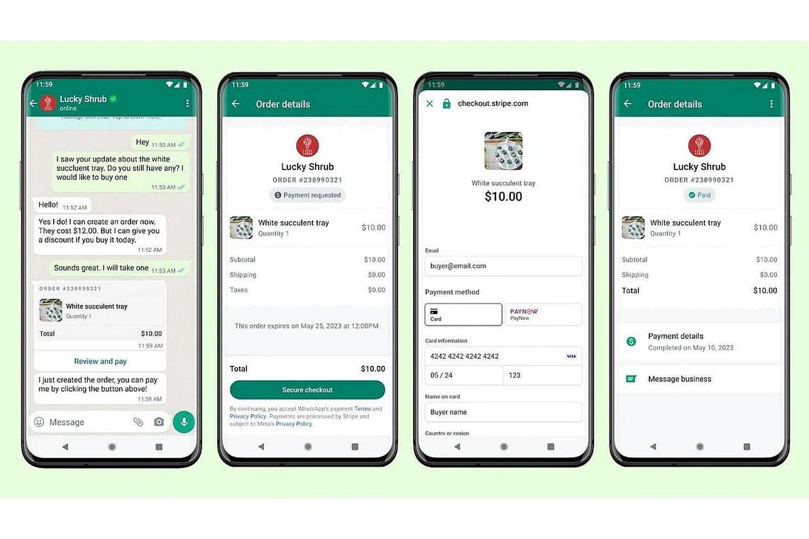 Ciri ini membolehkan penduduk Singapura dengan nombor WhatsApp yang didaftar di sini untuk membayar menggunakan kad kredit, debit atau PayNow dalam perbualan WhatsApp mereka.