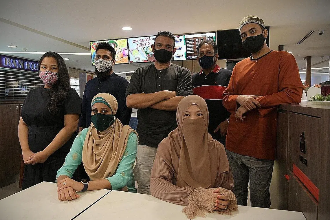 BERSATU TEGUH: (Berdiri, dari kiri) Pemilik Ikan 1986, Cik Syedah Hanna Sahari dan Encik Muhammad Shaheed Abdul Latiff; Dr Malik; Encik Mohamed Rafeek Mohamed dari Rafeek Tea; Encik Abdus Salam Akber Ali dari Ministry of Rojak; isteri Dr Malik, Cik Shireen Ikhsan, serta pemilik bersama Ministry of Rojak, Cik Nadira Ahamed Basir. - Foto BM oleh NG SOR LUAN -
