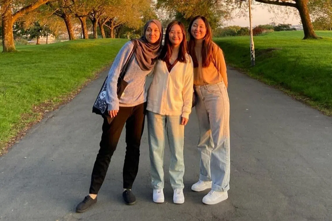 BERJIMAT:(Dari kiri) Cik Syaziyah bersama rakan-rakan warga Singapura Cik Jasmine Tan dan Cik Li Lixin. - Foto ihsan MUSFIRAH SYAZIYAH JALAVDDIN -