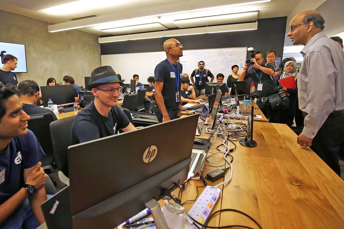 HIMPUNKAN BAKAT TEKNOLOGI: Encik Tharman (paling kanan) sedang bercakap dengan salah seorang bakat di Entrepreneur First yang beroperasi di SGInnovate. - Foto ZAOBAO -
