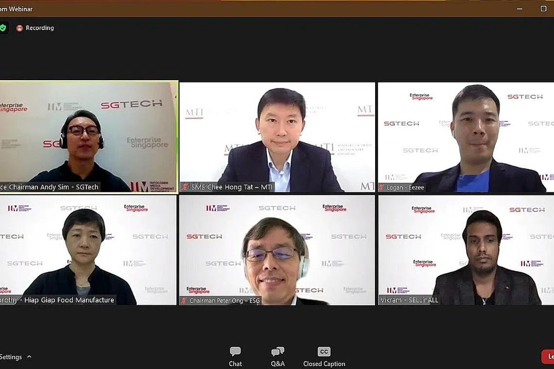 PANELIS: (Dari kiri, atas) Moderator dan Naib Ketua Pertama, SGTech, Encik Andy Sim; Encik Chee Hong Tat; Ketua Pegawai Eksekutif dan pengasas bersama, Eezee.sg; (kiri, bawah) Cik Dorothy Nah, Pengurus Besar Hiap Giap Food Manufacture; Encik Peter Ong, pengerusi ESG dan Encik Vikraman Ilango, pengasas dan Ketua Pegawai Eksekutif SELLinALL, sewaktu sesi perbincangan webinar semalam. - Foto IMDA -