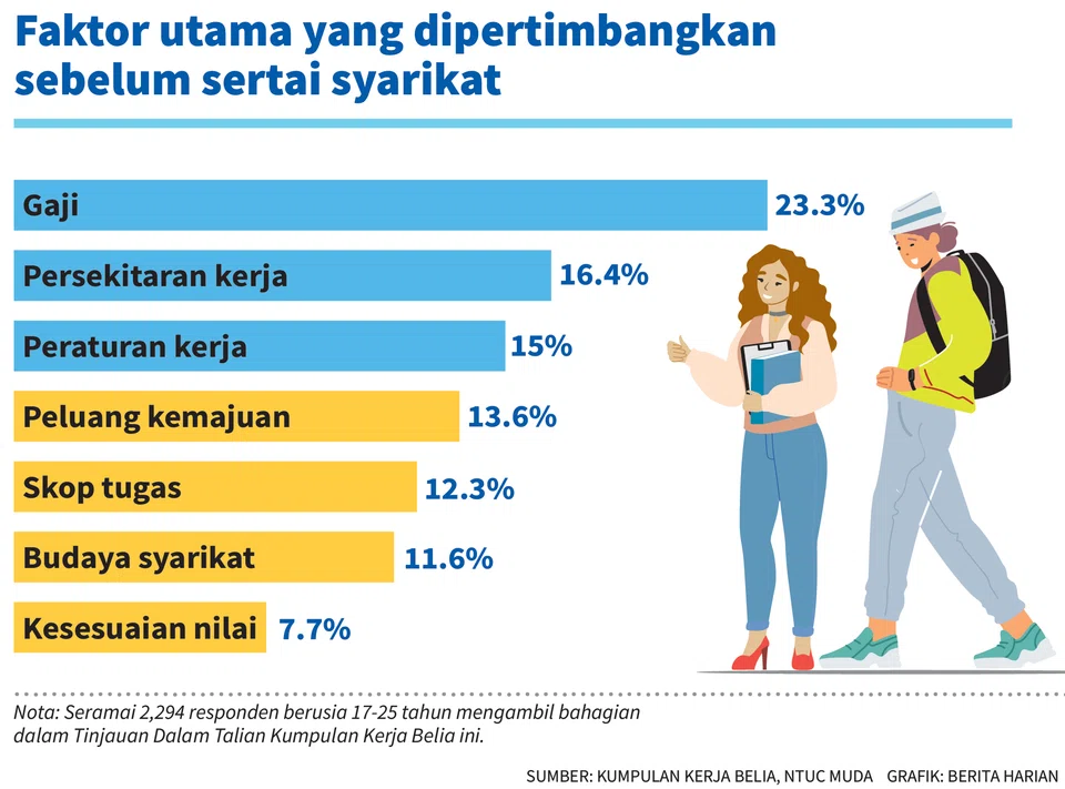 Tinjauan yang dijalankan kumpulan kerja tersebut juga mendapati tiga perkara utama yang diambil kira oleh belia sebelum menyertai sesebuah syarikat ialah gaji (23.3 peratus), persekitaran kerja (16.4 peratus) dan peraturan kerja (15 peratus).