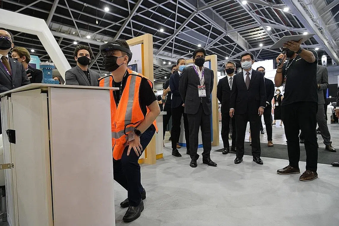 TINJAU TEKNOLOGI BARU: Encik Heng Swee Keat (dua dari kanan) mengunjungi kios Microsoft di ITAP 2021 di mana seorang pegawai menunjukkan HoloLens, iaitu sepasang cermin mata pintar realiti campuran yang dibangunkan dan dihasilkan oleh Microsoft, semalam. - Foto BH oleh NG SOR LUAN -