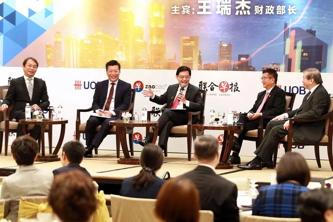 DIALOG PASCA BELANJAWAN: Menteri Kewangan, Encik Heng Sweet Keat (tengah, memegang mikrofon) bersama-sama panelis undangan membincangkan peluang syarikat tempatan dalam meningkatkan keupayaan untuk meluaskan sayap dan tidak hanya tertumpu pada permintaan domestik yang kecil di sini. - Foto LIANHE ZAOBAO -