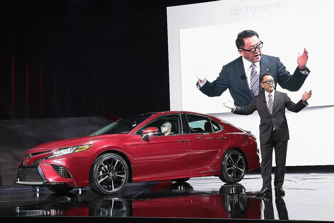 PROMOSI KERETA: Encik Akio Toyoda sedang memperkenalkan kenderaan baru Camry 2018 di Pameran Automotif Detroit. - Foto AFP -