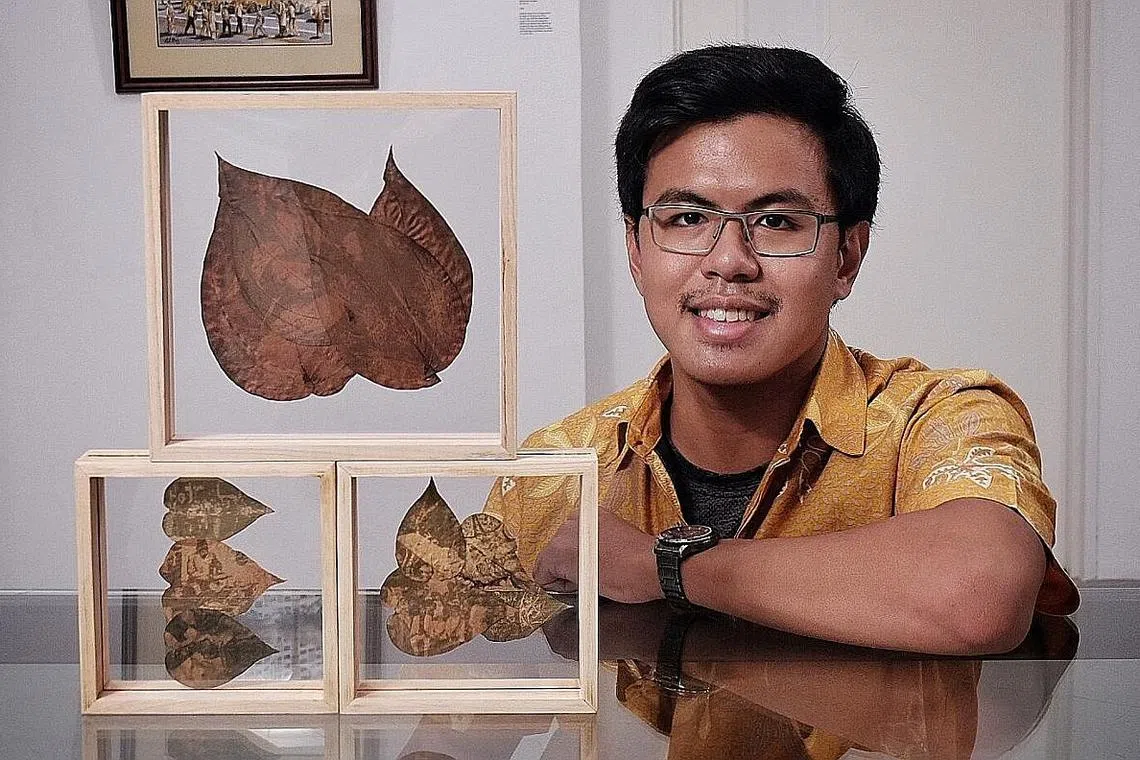 Encik Rusydan, 23 tahun, turut mempamerkan tiga kerja seni berupa proses cetakan klorofil pada daun sirih yang diberi nama Layu Dedaun Anak Dara pada pameran 'Rewang', anjuran Apad di balai seni Maya Gallery.