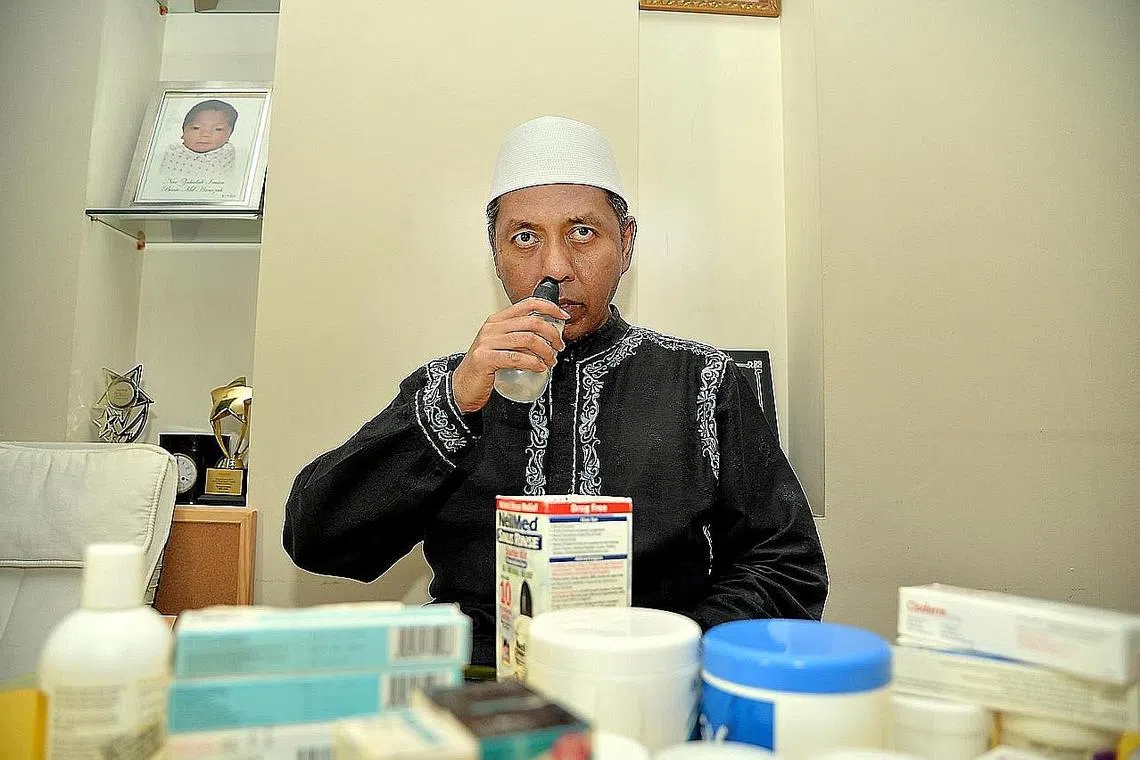 TARIK NAFAS LEGA: Ustaz Mohamad Hamzah, yang menghidapi sinus kronik, semput dan penyakit kulit psoriasis, berasa lega mendapat rujukan untuk memperolehi Bantuan Kewangan Asatizah (AFA) kendalian Persatuan Ulama dan Guru-Guru Agama Islam Singapura (Pergas) bagi mengurangkan beban kewangan rawatan kesihatan serta kehidupan beliau. - Foto M.O. SALLEH -