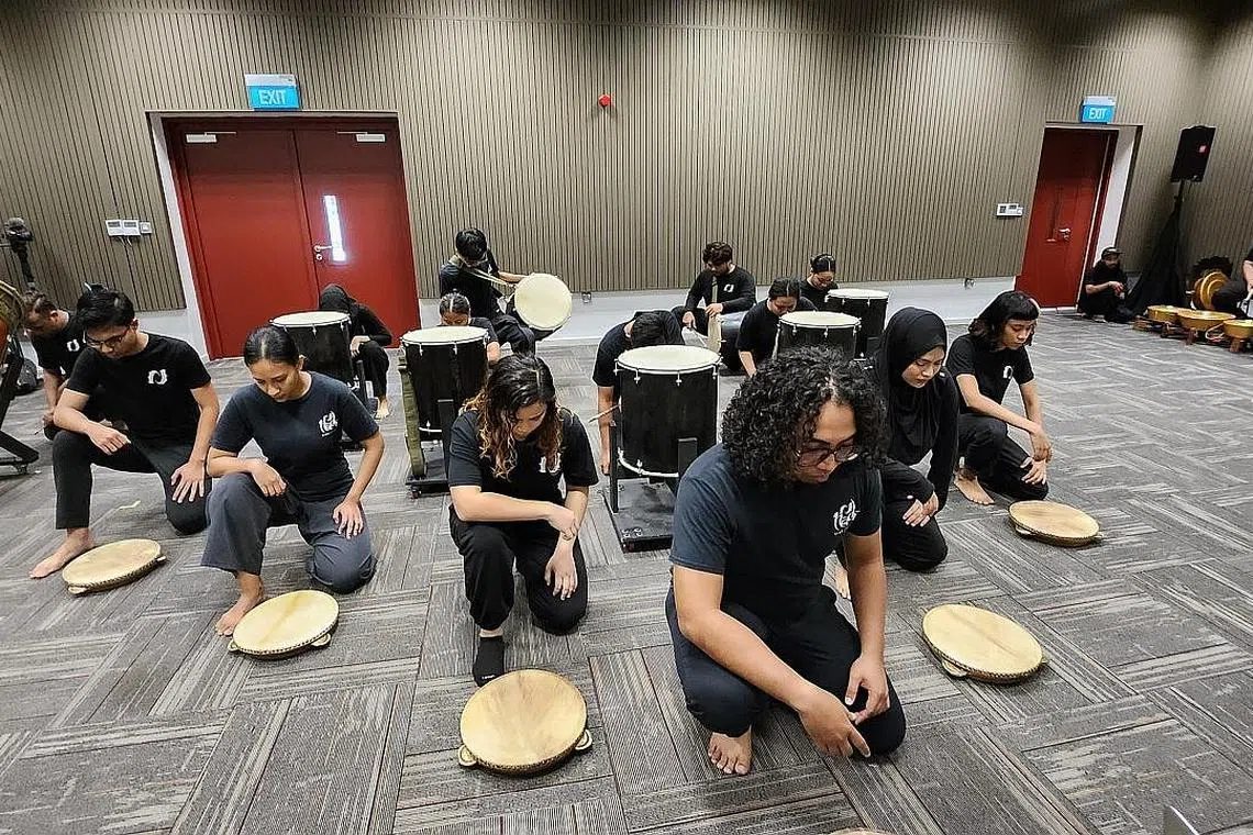 BERGENDANG SAMBIL BERCERITA: Ahli Kumpulan Nadi Singapura sedang giat berlatih untuk persembahan minggu depan di Victoria Theatre. -