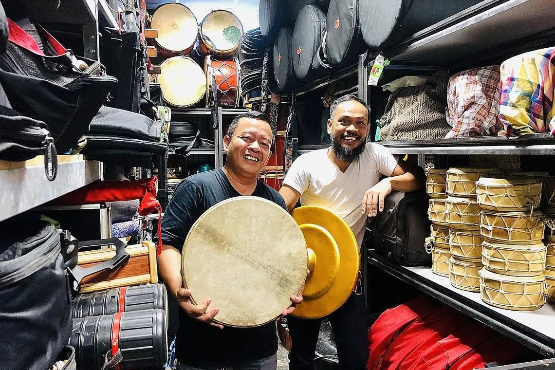TIDAK PUDAR: Penggerak Nadi Singapura (dari kiri) Encik Yaziz Hassan dan Encik Riduan Zalani beralih dari menyajikan muzikal gah, Fatih - The Prince and The Drum kepada persembahan tentang Kampong Berani di pesta seni Aliwal Arts Night Crawl Sabtu ini. - Foto BH oleh HARYANI ISMAIL -