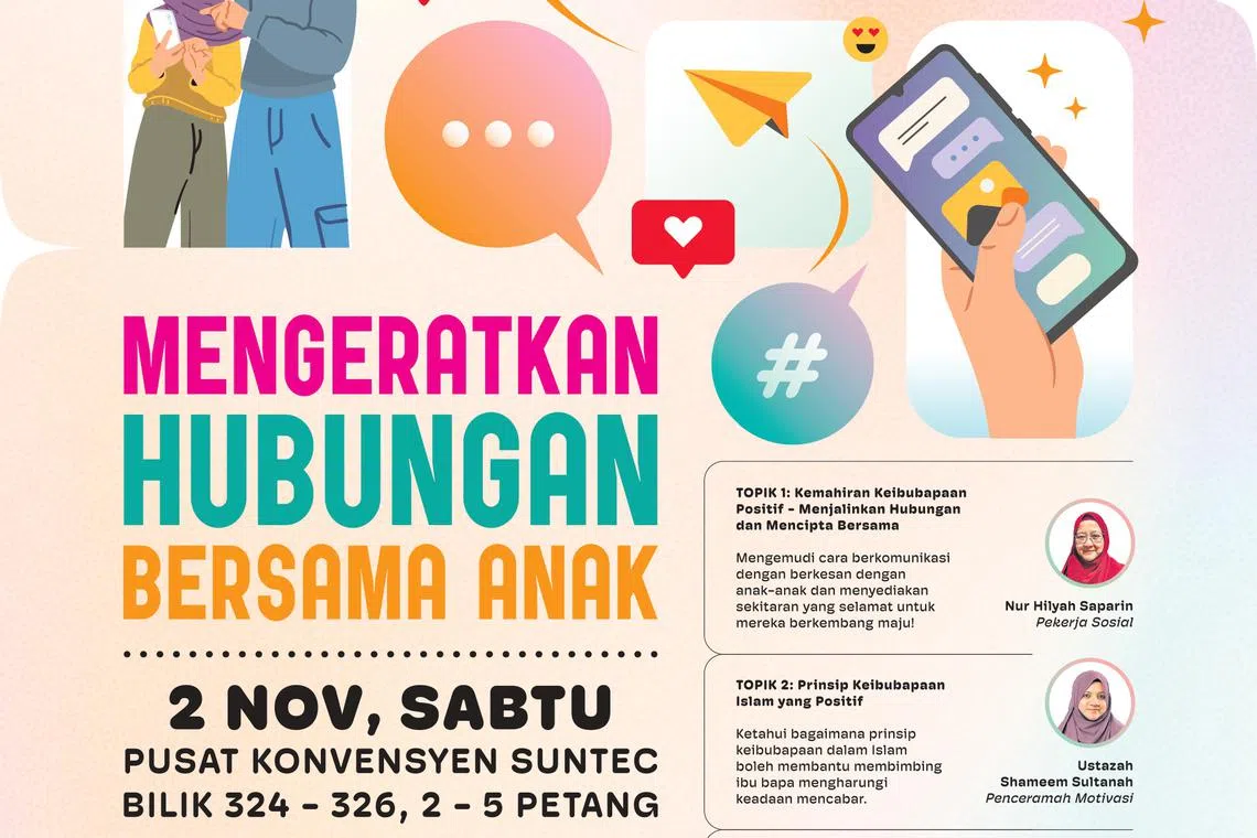 Acara berjudul, Mengeratkan Hubungan Bersama Anak, itu akan diadakan dari 2 hingga 5 petang di Pusat Konvensyen Suntec.