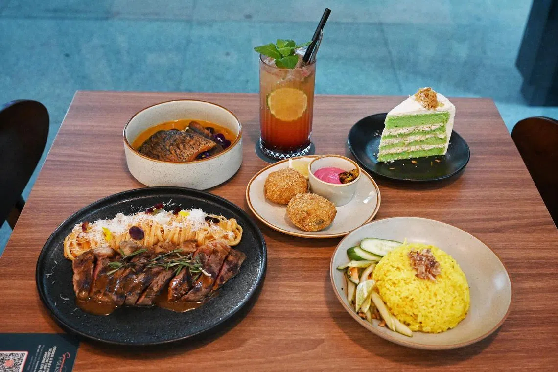 (Dari kiri) Hidangan Nyonya Assam Barramundi dengan Nasi Kuning, Orange Grenadine Soda, Kek Onde-Onde, Crab Cake dan New York Strip Linguine. - Foto BH oleh KHALID BABA