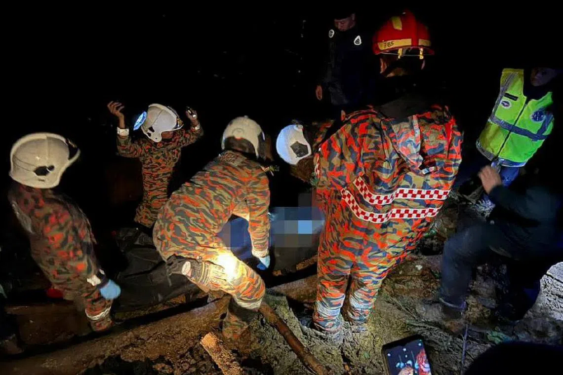 CAMERON HIGHLANDS: Dua maut, manakala tiga lagi dikhuatiri tertimbus dalam kejadian tanah runtuh kira-kira 2.10 pagi, 26 Januari, di Kampung Batu 59, Blue Valley, Cameron Highlands, Pahang.