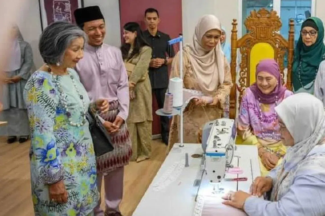 Tuanku Aishah Rohani (tiga dari kanan) bersama Cik Padzilah Enda (empat dari kanan), melihat proses menjahit sejadah di Galeri Pelawat Siti Khadijah di Laman Khadijah, Nilai, Negeri Sembilan. - Foto BHM