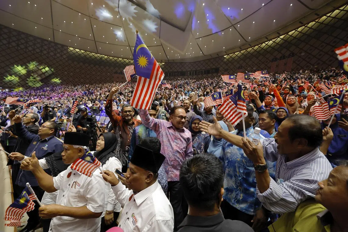 RAIKAN BERSAMA RAKYAT: Perdana Menteri Malaysia, Datuk Seri Anwar Ibrahim (tengah), mengibarkan bendera Malaysia Jalur Gemilang bersama hadirin semasa hadir pada Majlis Amanat Perdana Hari Kebangsaan 2023 di Pusat Konvensyen Antarabangsa Putrajaya (PICC) pada Rabu. - Foto BERNAMA