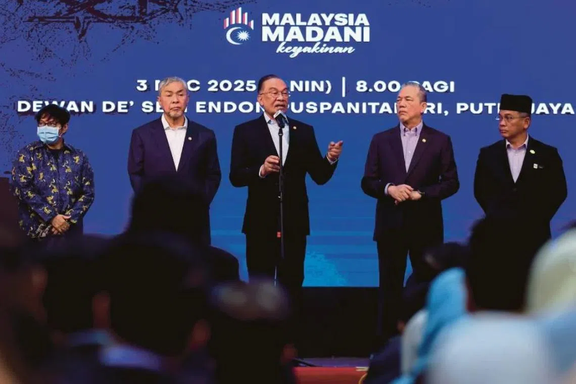 Perdana Menteri Malaysia, Datuk Seri Anwar Ibrahim (tiga dari kanan), menyampaikan ucapan pada Perjumpaan Perdana Menteri Bersama Warga Jabatan Perdana Menteri di Putrajaya, pada 3 Mac.