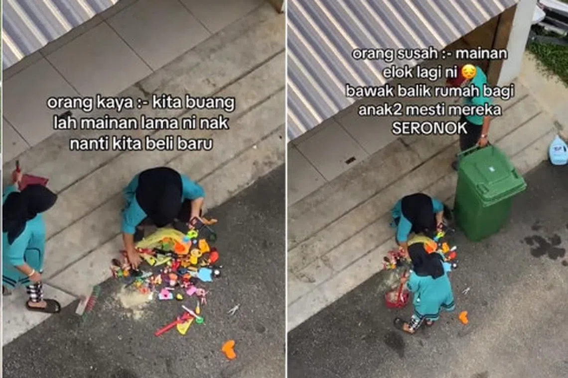 Menerusi video itu, dapat dilihat seorang wanita mencangkung sambil memeriksa barang mainan yang telah dibuang.